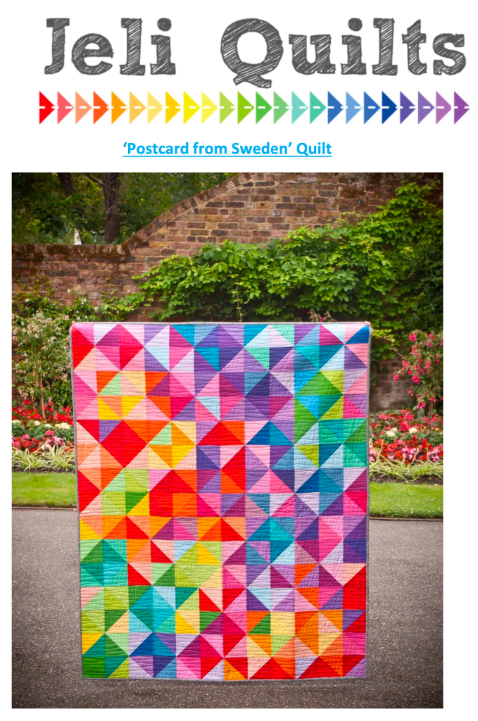 With that as a warm up…I’ve commenced the “Postcards from Sweden” quilt I’d planned for last year. This quilt was designed by Kelly Liddle for Jeli Quilts. I am very excited to get this one made up because A-It’s very pretty and cheerful and B- I purchased the kit from Craftsy (remember them) somewhere around 2017 (!) so happy to be actually working on it! Here’s the photo from the pattern: