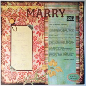 In the midst of dog drama I managed my layout for the day.  The prompt was “no picture” that is pretty much sacrilege around here.  But, I’m up for the challenge…went through my bin that I had set up during the “Twelve” class I’m taking @ BPC and what did I find but the receipt from the dinner where Charlie proposed.