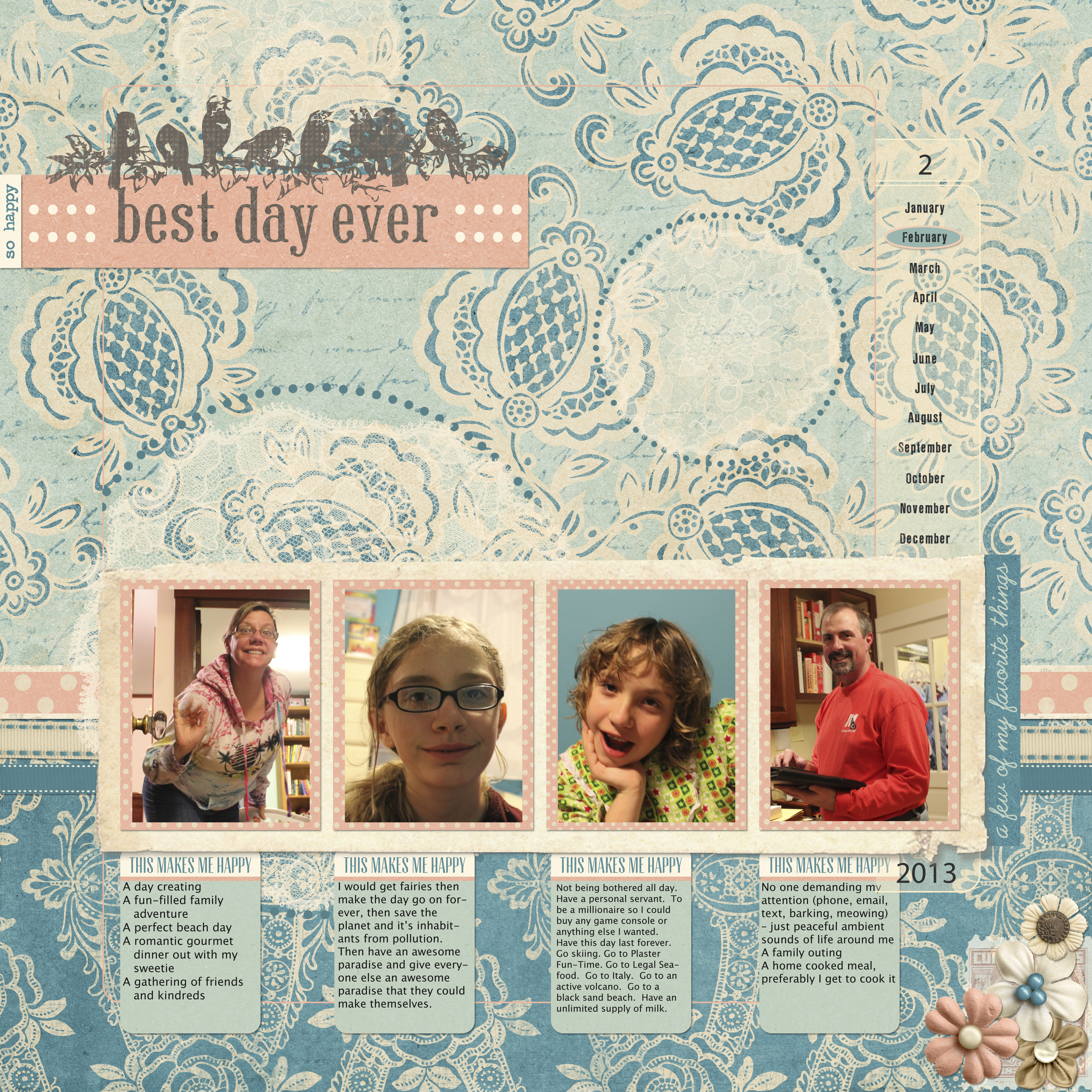 Day two’s challenge was to create a layout about your perfect day. Not content to just keep all the fun to myself, I hounded my family for their “perfect” days. Charlie was awesome (but had to be admonished to keep it clean, it’s a family show after all) The girls had tons of questions but managed to settle on a few of their most important items.