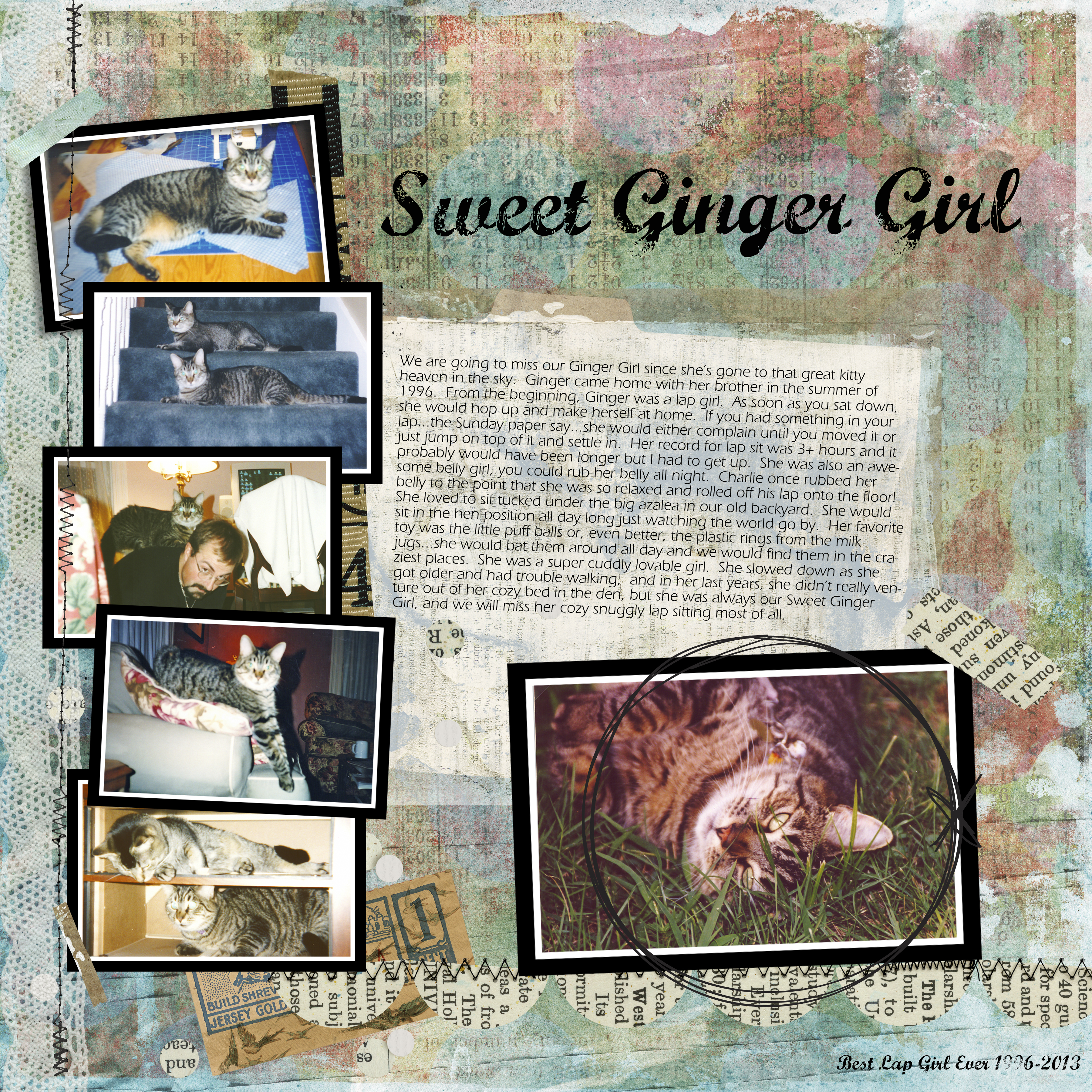 Last week, we had to say good-bye to our wonderful lapsitting girl after almost 17 years. Ginger (and her brother Fred, who is still with us) came home with us a month after we bought our first house and spent the next 17 years sitting on laps, receiving belly rubs, and living a very good and well loved life. I put together this remembrance of our sweet Ginger girl.