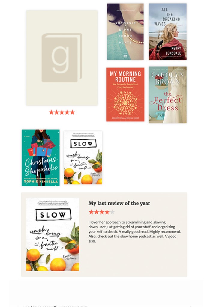 I have discovered over the course of the last year that I am really not good at tracking…I think I start out strong and quickly lose interest because it’s usually too annoying or time consuming or frustrating. There are a few things however I do manage to keep a bit of a handle on because they are easy. Keeping track of my reading has been made infinitely easier with the Goodreads app on my phone and iPad. My preferred way to read is with an actual paper book in my hands but I have been reading on my iPad more and more especially when I travel and it’s so easy to pop over to the Goodreads app and update when I’ve read a book. I’ve also participated in their Reading Challenge for the last few years and this year is the most books yet at 44 when my goal was 30. I will also add that while I am a huge podcast listener, I do not listen to audio books so all of my books are read not listened to.