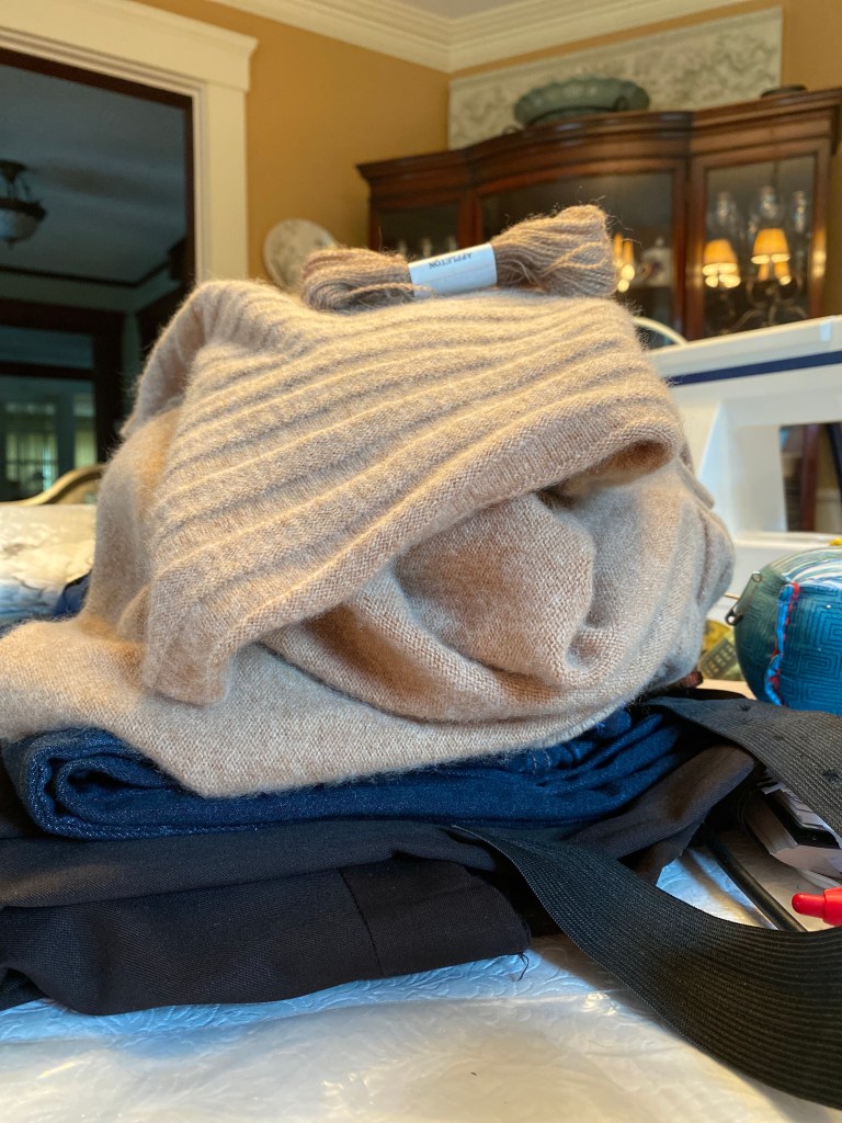 Sewing makes included: Hemming and altering 3 Prom Gowns (!) : Drawstring shorts : Cashmerette Springfield Top in floral rayon : Sew Liberated Metamorphic reversible dress in sanded rayon (it’s like wearing secret pajamas!) : Butterick 2925 grey knit top (no idea where I got the fabric!) : 2 underwire bras in an Orange Lingerie weekend bra workshop : Helen’s Closet Patterns Elliot tee shirt in black jersey and Elliot Sweater in grey sweater knit : Helen’s Closet Patterns Blackwood Cardigan in denim blue herringbone french terry ( LOVE this pattern and have a cream sweatshirt material on deck for another sweater) and some more organizational pouches for Charlie out of my cotton fabric stash!